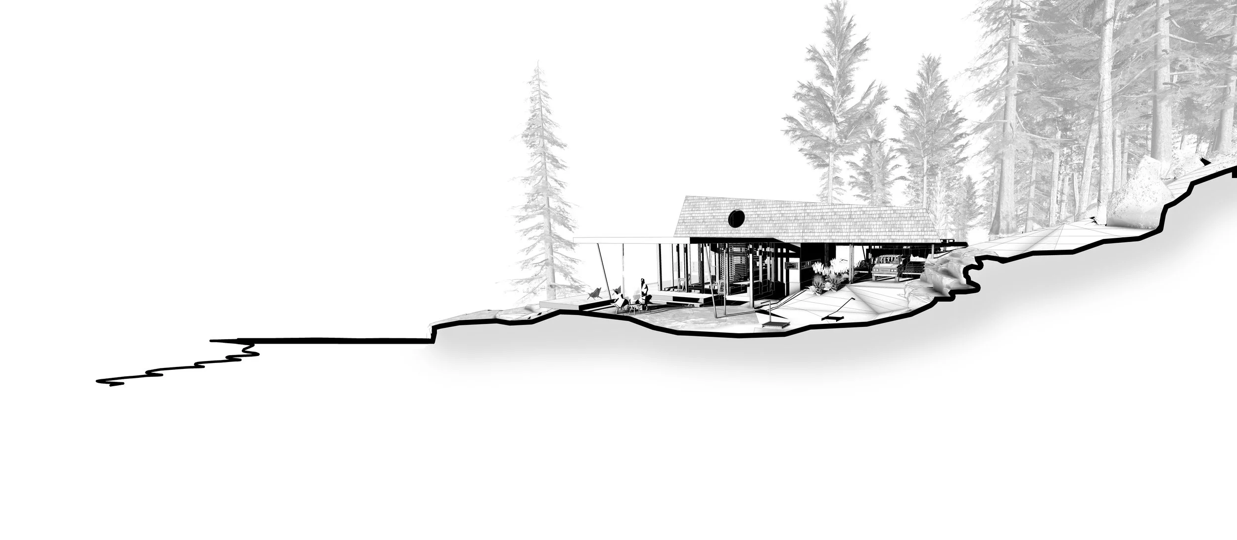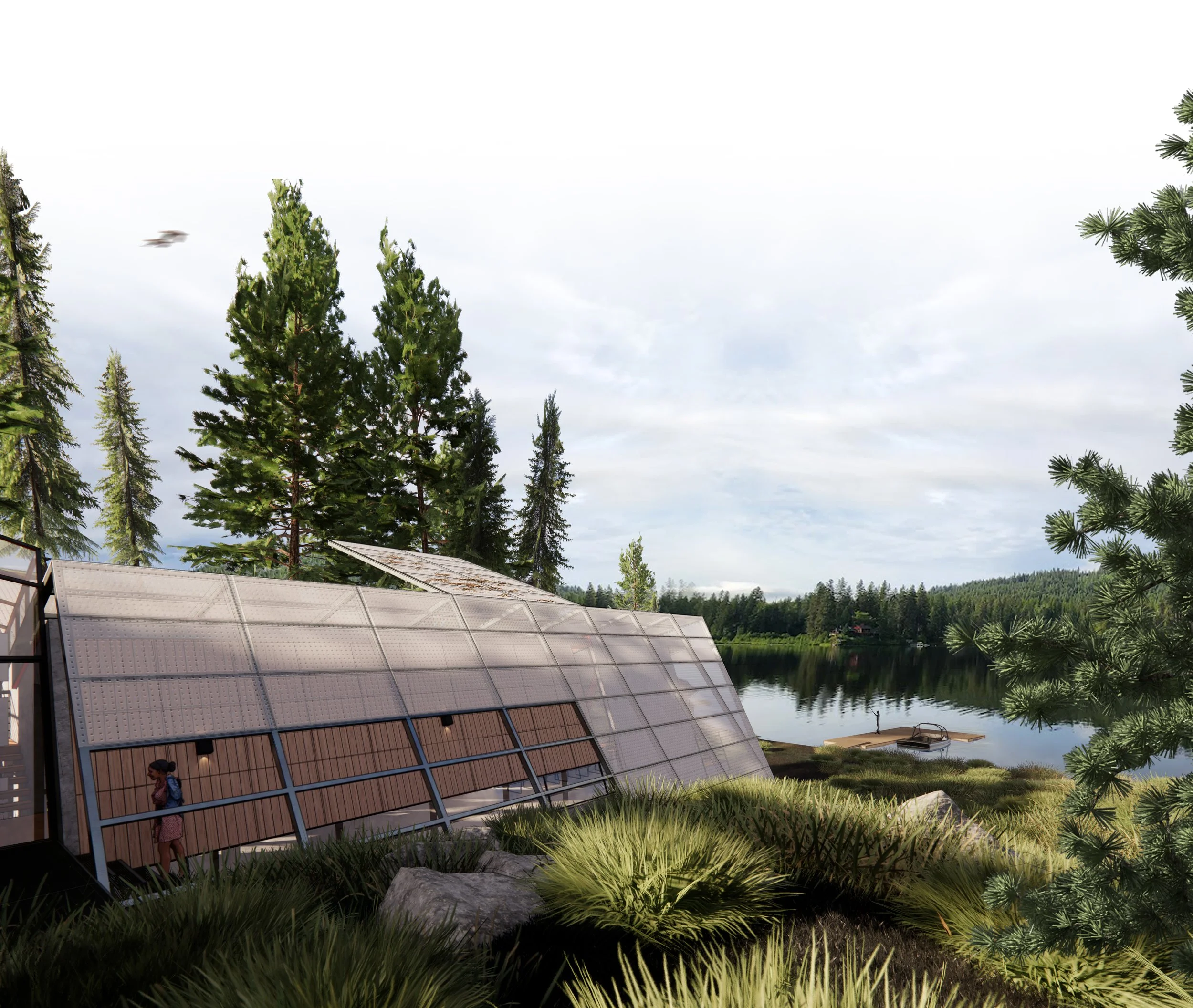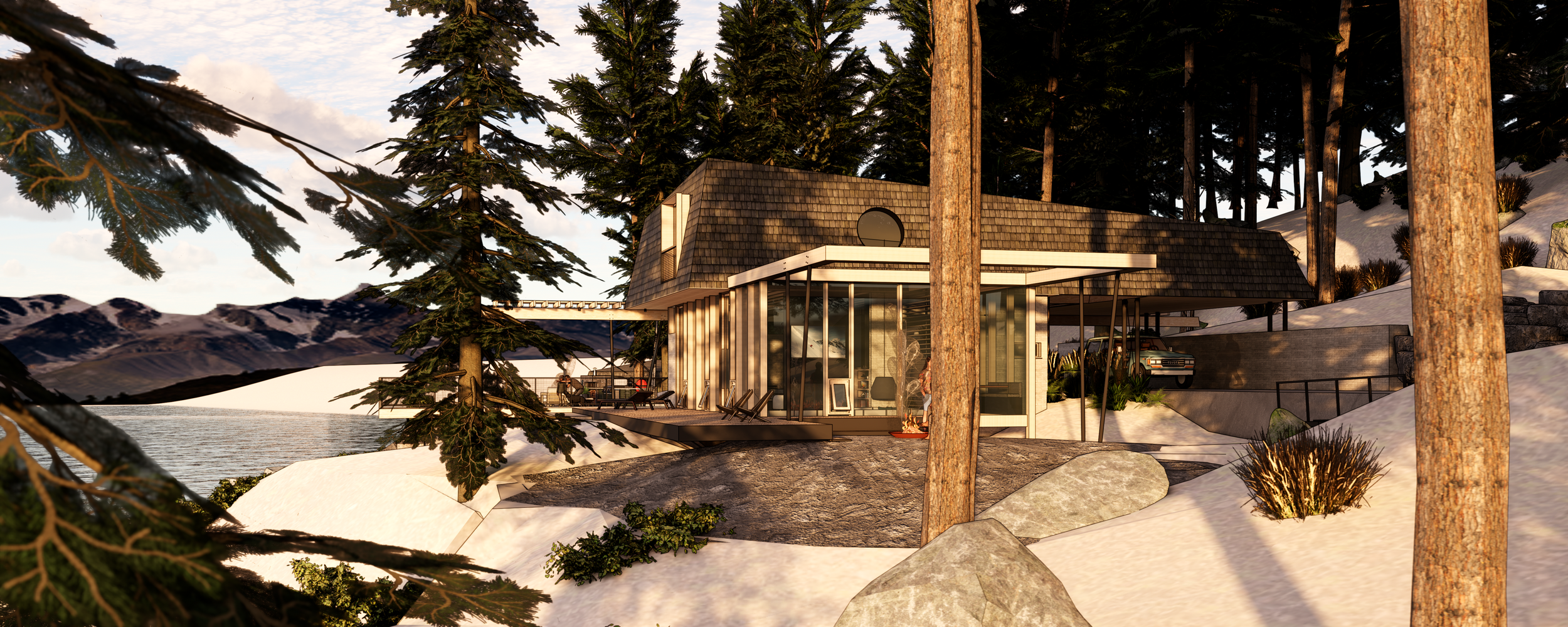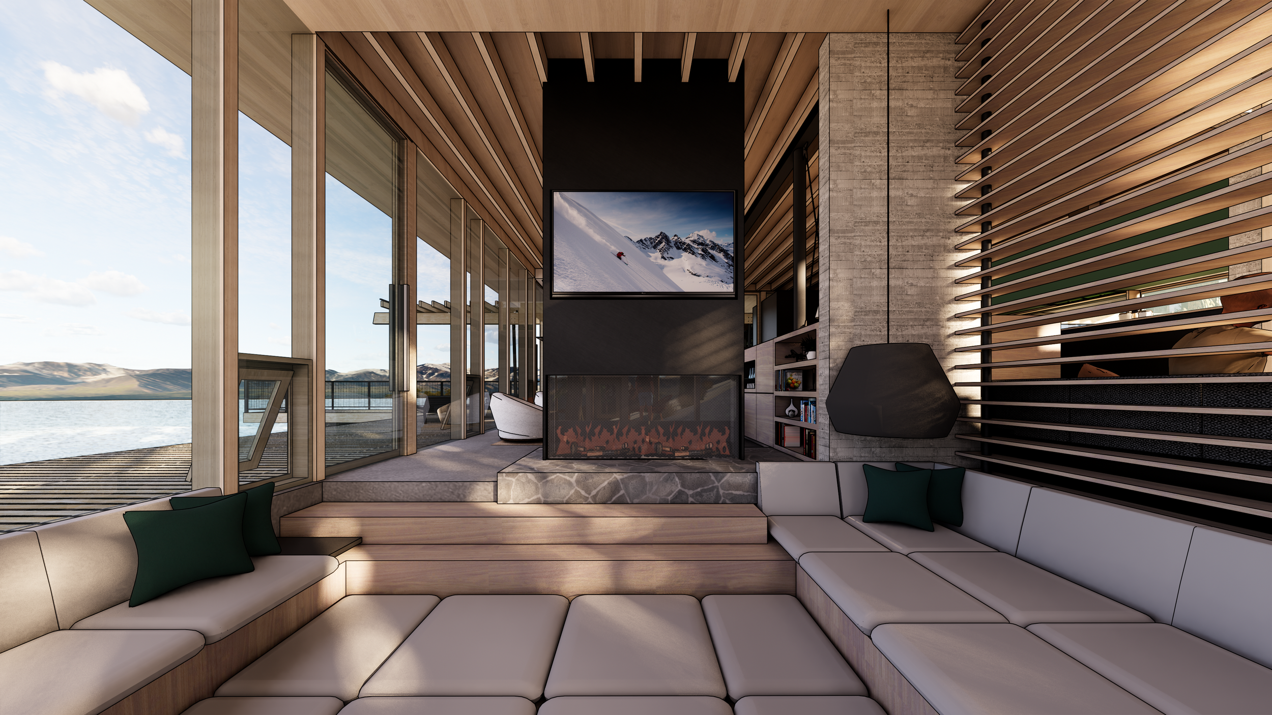Three structures are carefully positioned along the shores of Spirit Lake, ID to create a unified cabin complex. A main cabin serving anchors the prominent point, while a double-suite guest cabin is nestled discretely against the hillside. Further removed, the lively bunkhouse is strategically designed to pack in guests and focus activity around a central conversation pit.