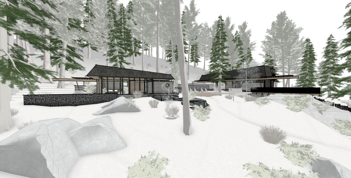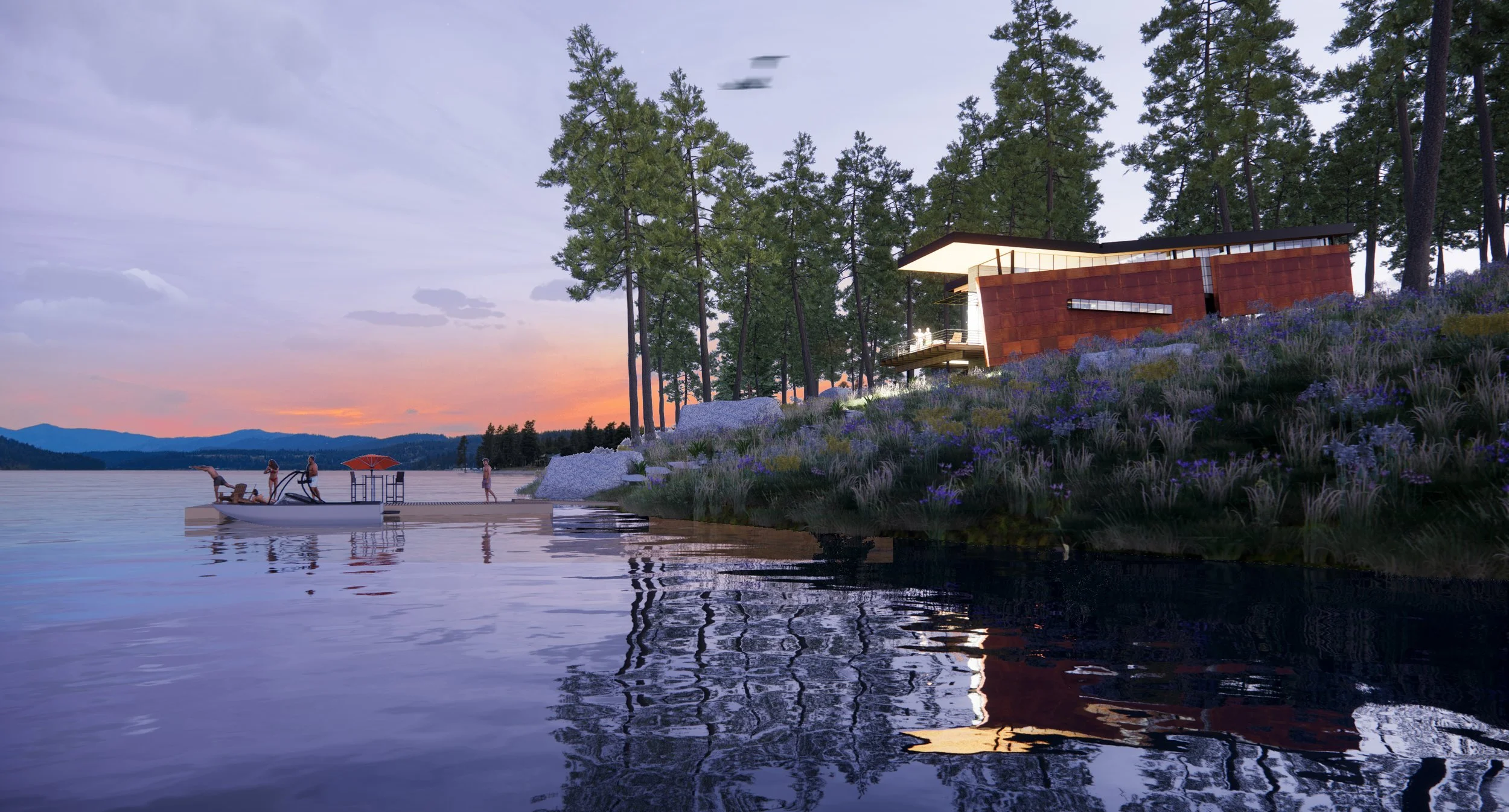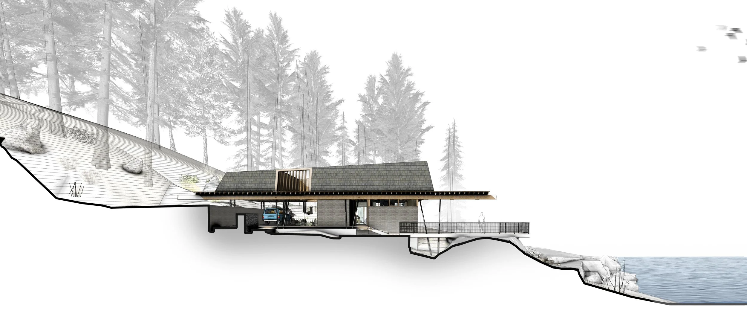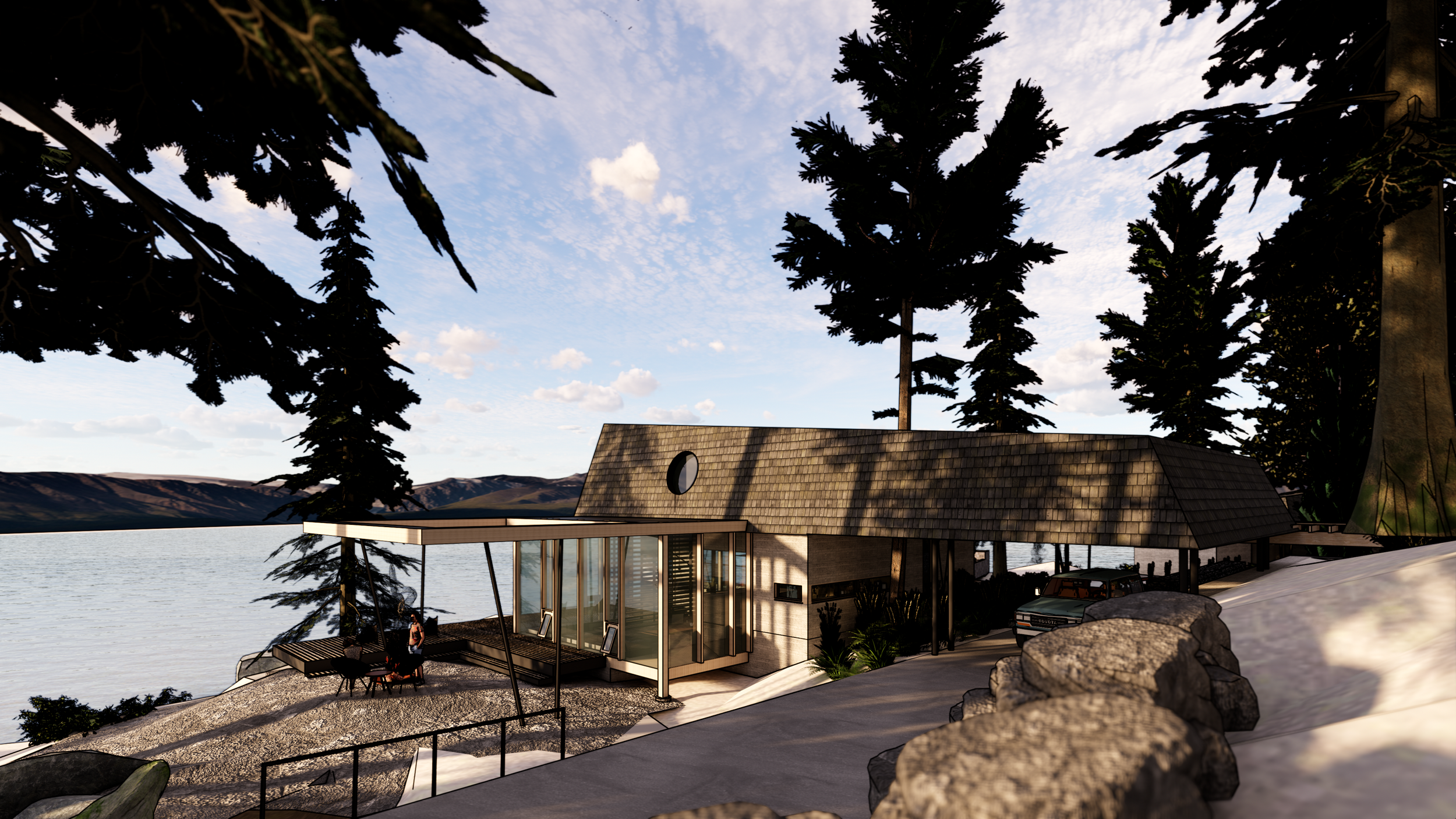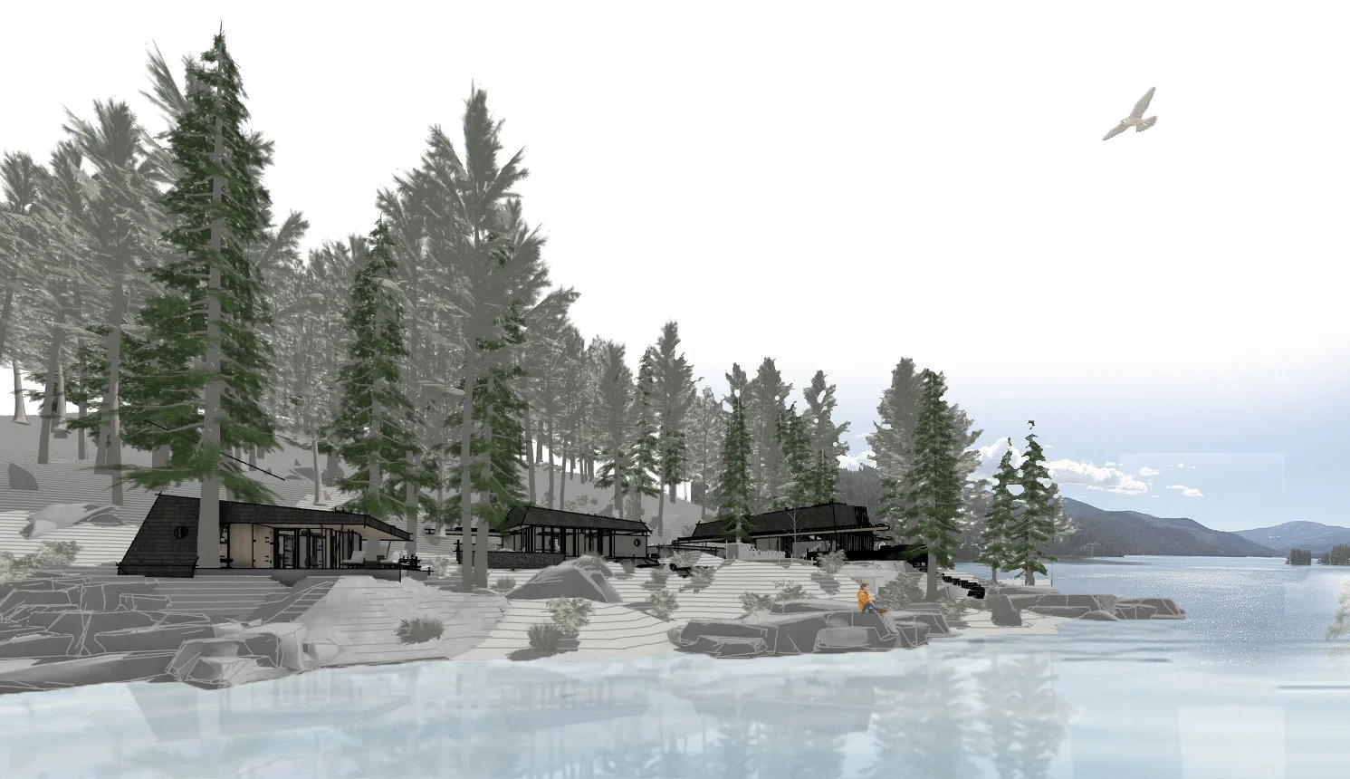 Three structures are carefully positioned along the shores of Spirit Lake, ID to create a unified cabin complex. A main cabin serving anchors the prominent point, while a double-suite guest cabin is nestled discretely against the hillside. Further removed, the lively bunkhouse is strategically designed to pack in guests and focus activity around a central conversation pit.