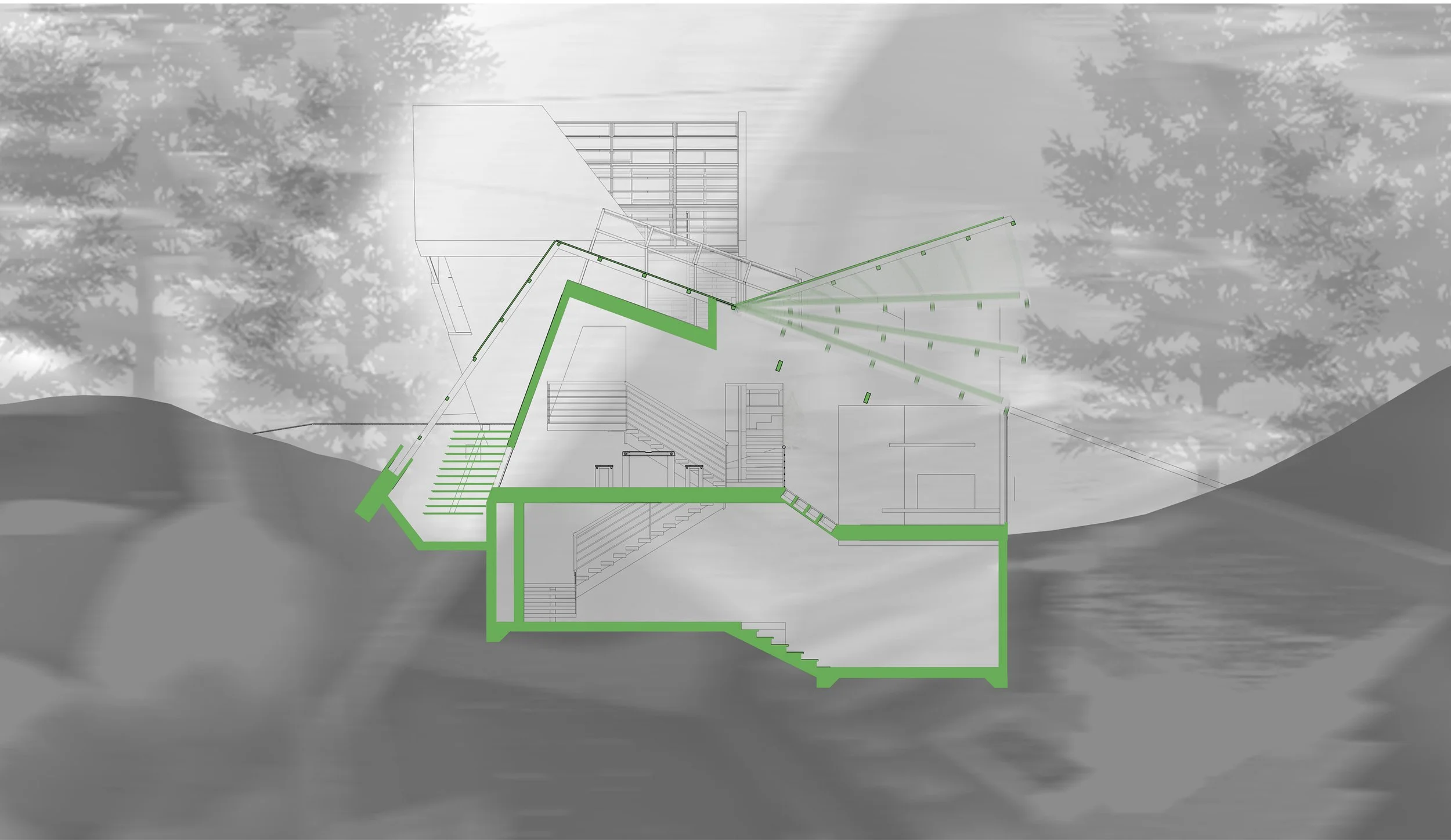 While taking full advantage of the lake views, the house tucks back into nature and gains the feeling of a forest cabin. The mechanized perforated metal panel system allows for cover from the falling debris and swaying motion of the ever changing coniferous forest. The ability to operate the mechanized flaps allows for an amazing experience among the trees with carefully considered skylights, windows, and program arrangement. The industrial materiality is contrasted inside by soft and warm woods from the surrounding flora, while the metal mesh creates a transition from solid concrete to the porosity of the forest.